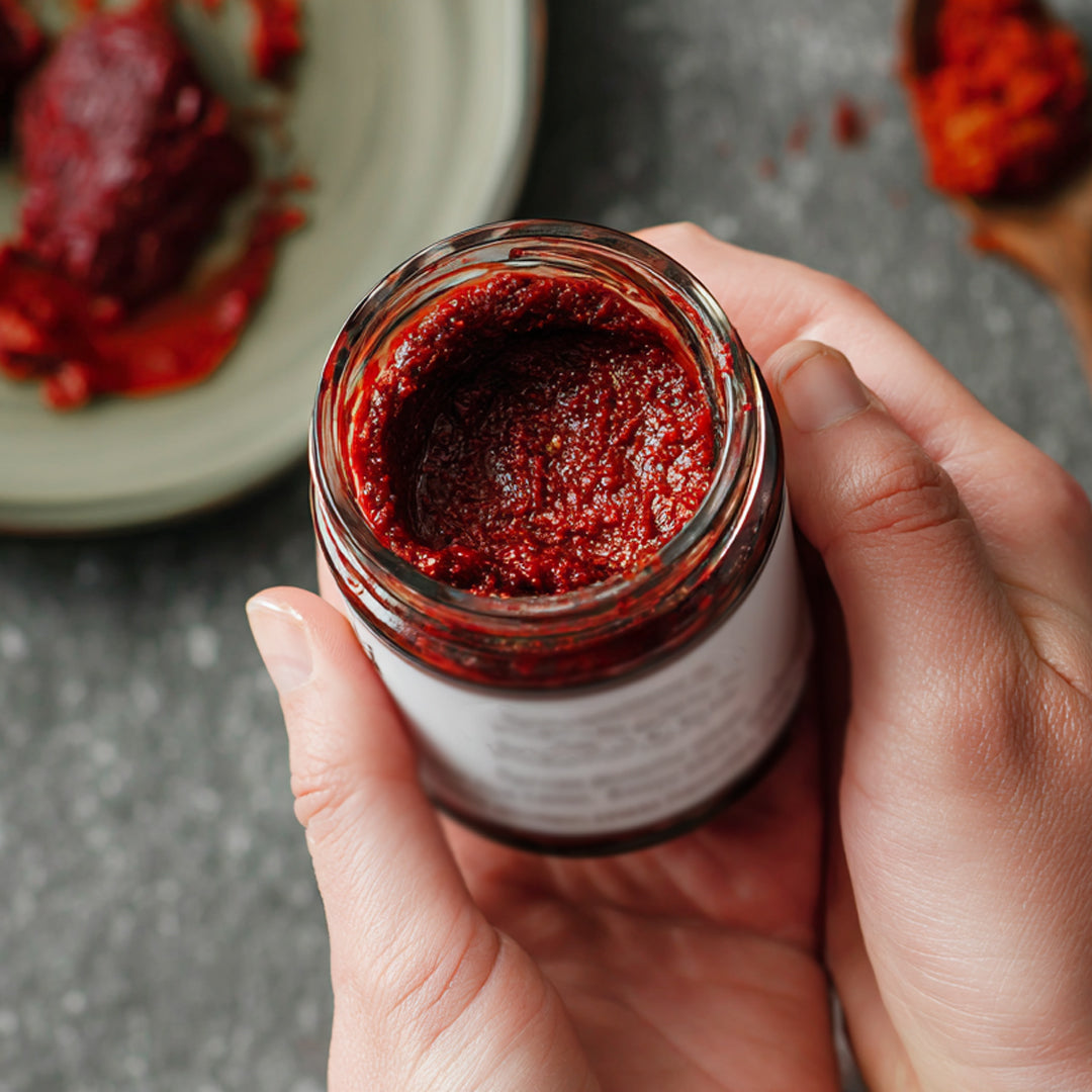 A deeply roasted red chilli paste made from 81% chilli puree, blended with olive oil, paprika and a touch of salt for a bold, smoky heat. The natural chilli flakes and seeds bring authentic texture and a slow-building warmth. Crafted without acidity regulators, stabilisers, fillers or starch - just pure, clean heat and depth of flavour.
